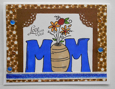 This card is one that I made to mail off to Send a Smile 4 Kids. The digi image is from Bugaboo digi stamps; the stamped sentiment is from Sweet n Sassy. The image was colored with promarkers, as well as, the blue strip across the middle of the white shimmer tape (CTMH). I also colored 3 of the white dots on the bg paper blue and added 3 clear skittles over top. That's one way to get a perfect match. And I used a corner punch on the brown mat. Not all moms like frilly, girlie cards.