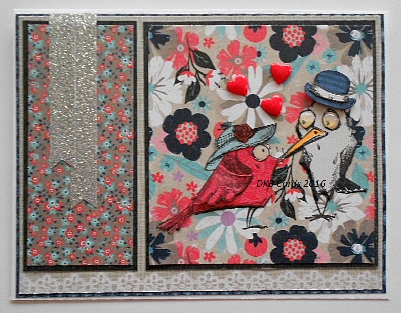 Today's Mojo Monday card is an Anniversary card for my DH's sister and her husband. I always try extra hard when creating cards for Ann because she is an excellent cardmaker herself, although she makes an entirely different type of card than I do. I think these fussy cut and paper pieced crazy birds will be perfect.