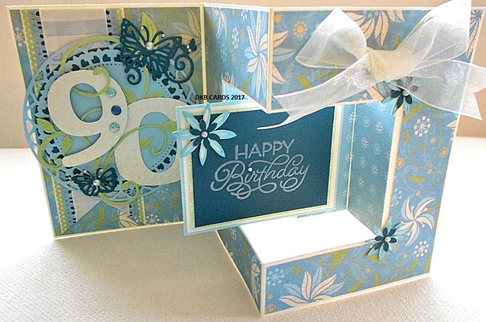 On the pop out frame: the sentiment (a freebie stamp from Cardmaking and Papercraft magazine) stamped in versa mark and heat embossed in pearl white and a pearl to dot the "i"; a 2 layer cricut cut flower with a dark blue punched flower and pearl in the center.