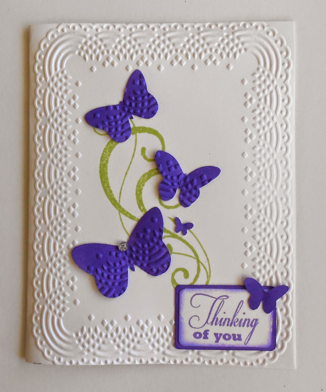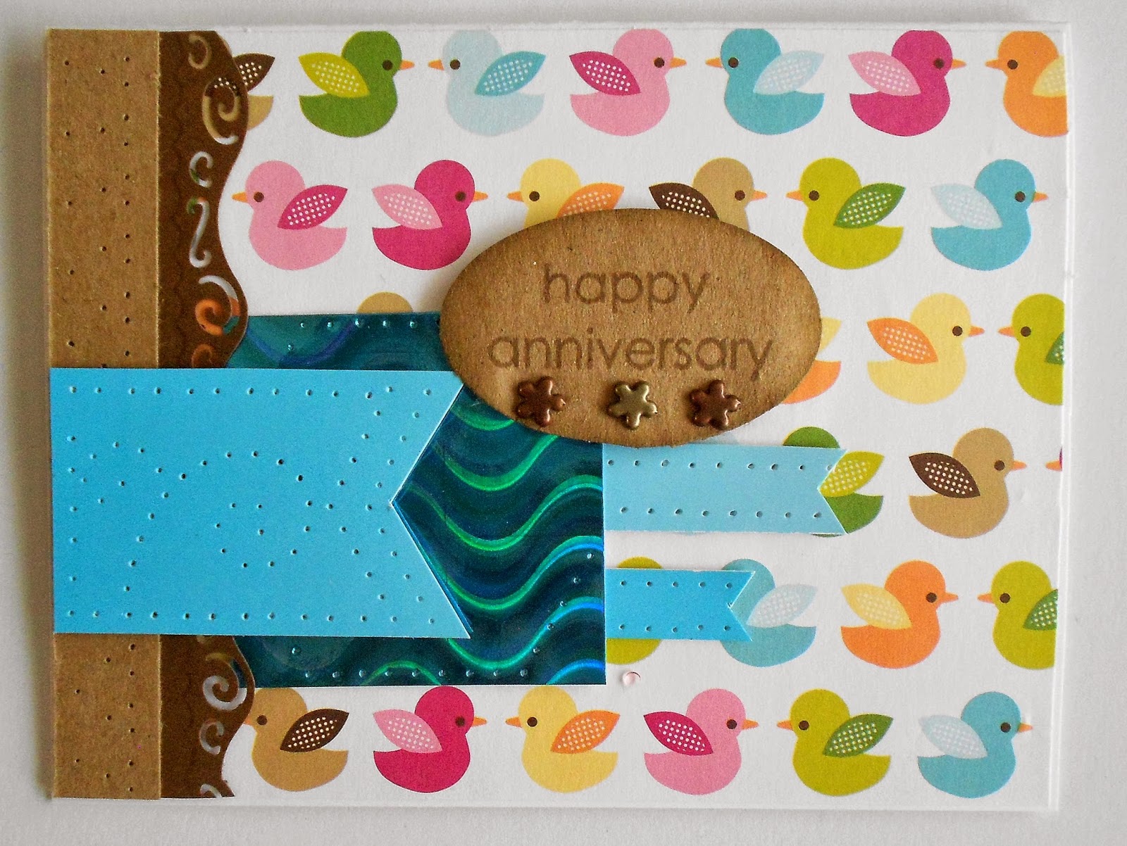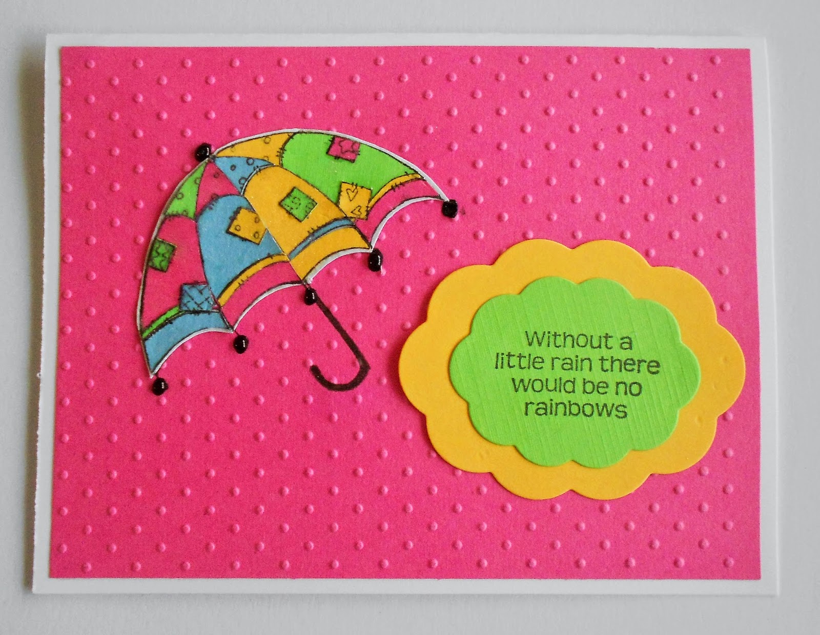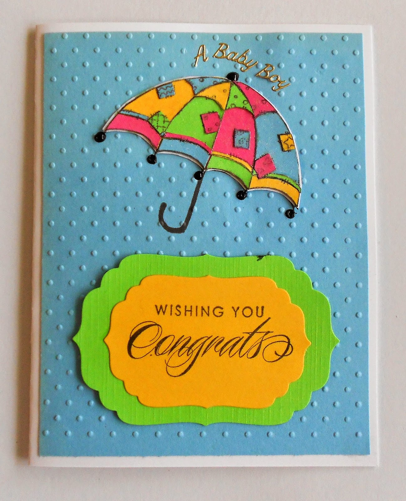 In the spirit of today's weather, I am posting the second card I made with the remaining umbrella pieces from my 'It's a Boy' card I shared with you on Saturday. This umbrella is a Great Impressions stamp, which I stamped 4 times on different colored papers and then did a lot of paper piecing. The sentiment is a CTMH stamp.