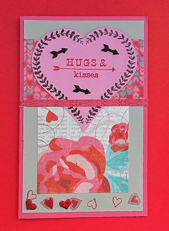 I used a CTMH Hugs and Kisses stamp, cutting out only the HUGS to mount in the center of the heart.