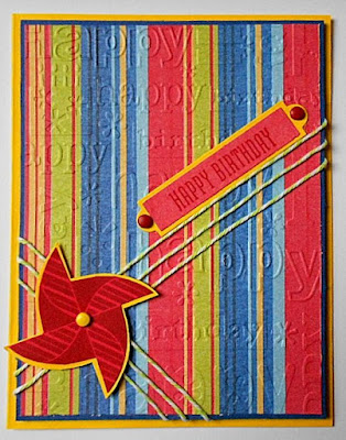 I used a Happy Birthday word embossing folder on the striped background just to make Twisted Sister happy.
