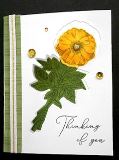 This past Saturday I attended Joyce Houck's annual Spring Fling, a fun get together where Joyce introduces some of the new items in the catalog. This is one of the cards we made. The yellow flower and green leaves and stems were already die cut for us. We simply stamped and colored them. Then, one by one, we cut an opening in the front of our cards using the same dies. Then we glued the flower to the inside of the card.