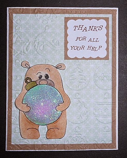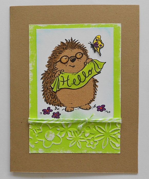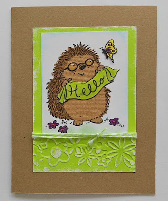 The background patterned paper was random stamped with a little bird's nest. The tree and frame dies are by intricutz dies. The tree was sponged with several shades of green and brown. The textured paper behind it was lightly brushed with water colors. Hello die is by Simon Says Stamps. Sentiment stamp, wood birds and waxy flax nest are CTMH retired items; Sentiment die by ODBD; Glitter paper from MFT.