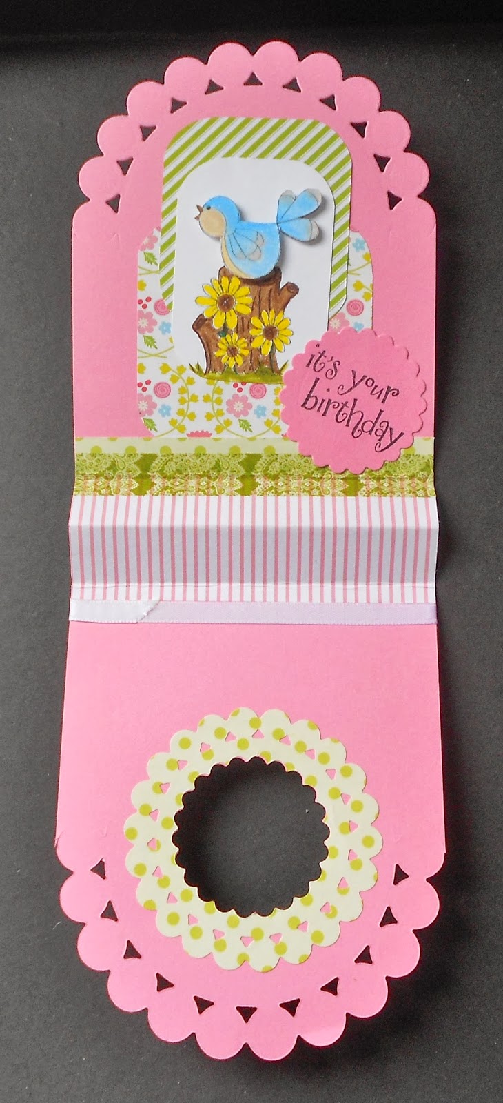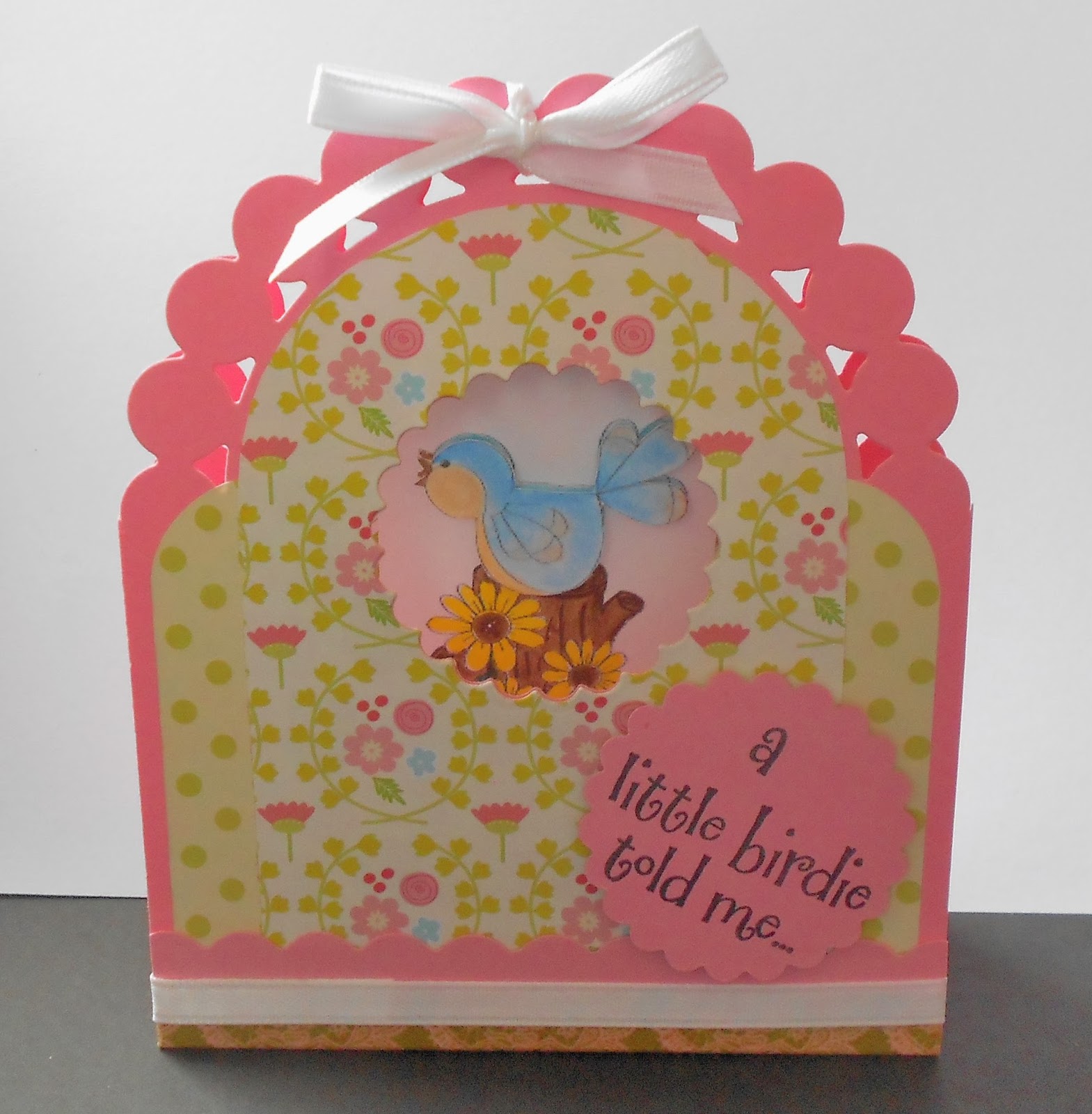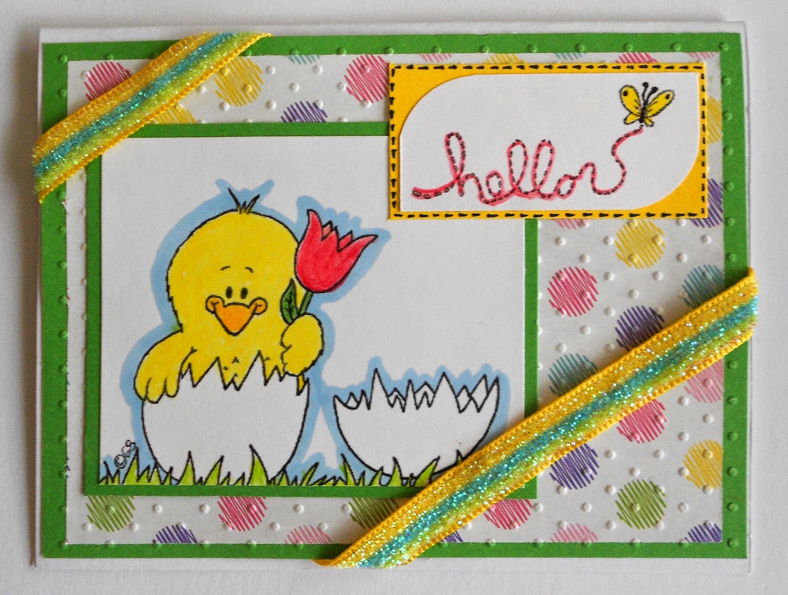 The background patterned paper was random stamped with a little bird's nest. The tree and frame dies are by intricutz dies. The tree was sponged with several shades of green and brown. The textured paper behind it was lightly brushed with water colors. Hello die is by Simon Says Stamps. Sentiment stamp, wood birds and waxy flax nest are CTMH retired items; Sentiment die by ODBD; Glitter paper from MFT.